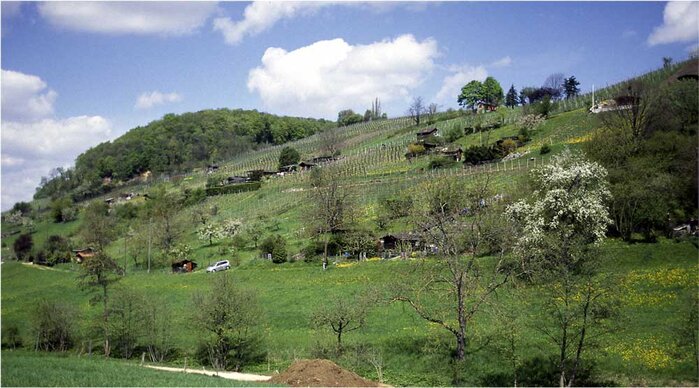 An den Wald schliesst auf der Südseite in Richtung Egglisgraben ein strukturell vielfältiger Rebhang an. Unsere Rebhänge sind biologisch interessant, weil zwischen den Rebparzellen extensiv bewirtschaftete Gartenareale liegen. Bestimmte Wiesen blieben seit Jahrzehnten ungedüngt, darin gedeihen klassische Arten der Blumenwiesen, wie die Feld-Witwenblume.