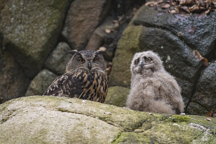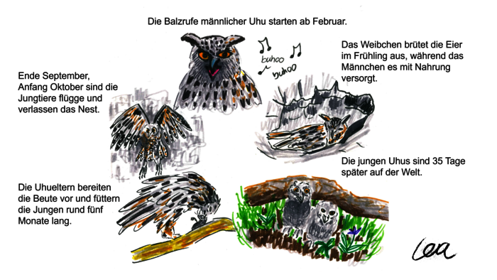 Alle unverdaubaren Bestandteile – wie Felle und Knochen – würgen die Tiere als kleine «Bällchen», sogenannte Gewölle, wieder hervor. Mit neun bis zehn Wochen sind die kleinen Uhus flügge und begleiten ihre Eltern auf der Jagd. Ende September bis Anfang Oktober verlassen die Jungtiere dann ihre Eltern und sind von nun an auf sich allein gestellt.