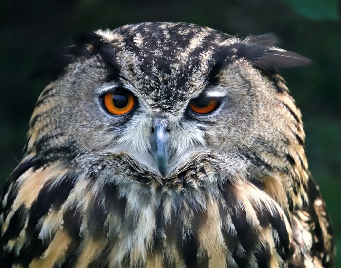 Der erste Blick täuscht: Die grossen Federohren des Uhus dienen nicht dem Hören, sondern geben vielmehr seine Stimmung wieder. Hat er gute Laune, ragen sie gerade in die Höhe. Nähert sich ein Feind, legt er sie eng an den Kopf an, reisst die Augen weit auf und sträubt das Gefieder.
