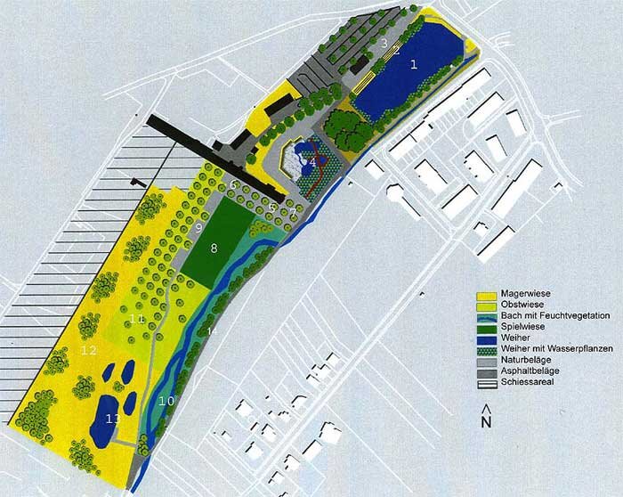 - Naturschutzzone mit Weihern: In den neuen Flachwasserbiotopen und Weihern finden gefährdete Amphibien, wie die Gelbbauchunke und die Geburtshelferkröte, Lebensraum. Dieses Gebiet dient dem Naturschutz und ist für Erholungssuchende nur punktuell zugänglich. Der Bereich ist mit Lebendhag und Eingangspforten gegen den Spielbereich bzw. den Hauptweg abgegrenzt.